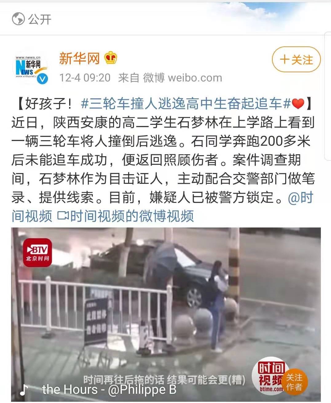 11月23日早上6:50分左右,安康市第二中學高二學生石夢林在去往學校途中,看到一輛疾馳的三輪車將一人撞倒在地,司機徑直離去。石夢林毫不猶豫追向肇事車,奮力追逐二百余米后,未能阻攔成功。眼見追不上肇事車輛,他又立即返回,報警妥善安置傷者后才回到學校上課。在案件調查期間,石夢林作為目擊證人,主動配合交警部門做筆錄、提供線索。目前,該案嫌疑人已經鎖定。