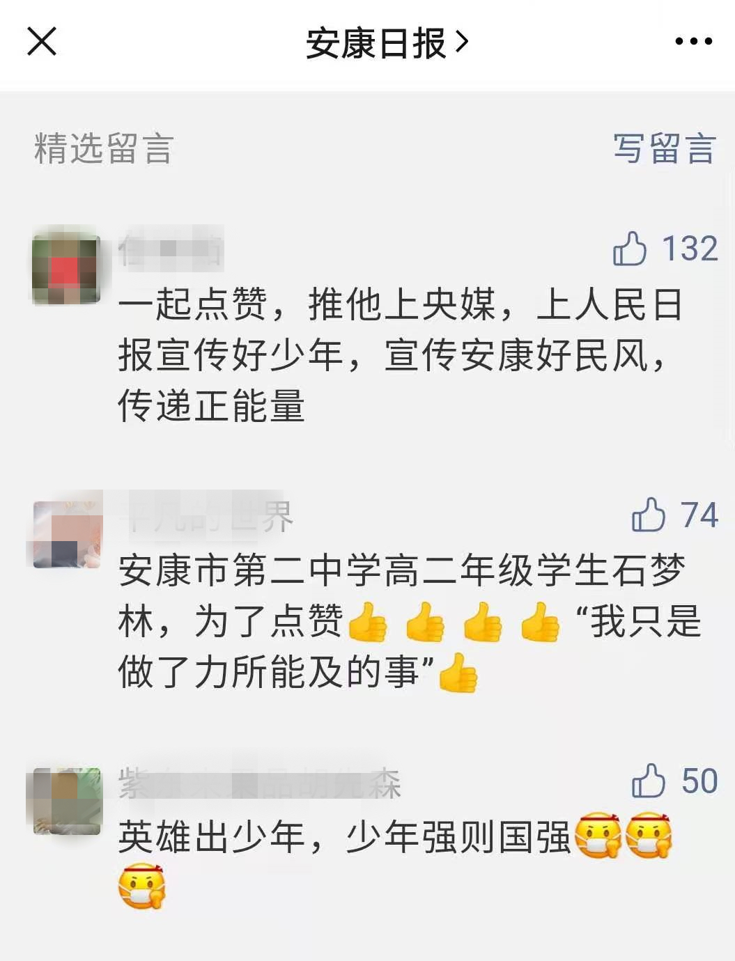 還有網友留言稱,“推他上央媒,上人民日報宣傳好少年,宣傳安康好民風,傳遞正能量”,@這位網友,你的愿望實現(xiàn)啦!