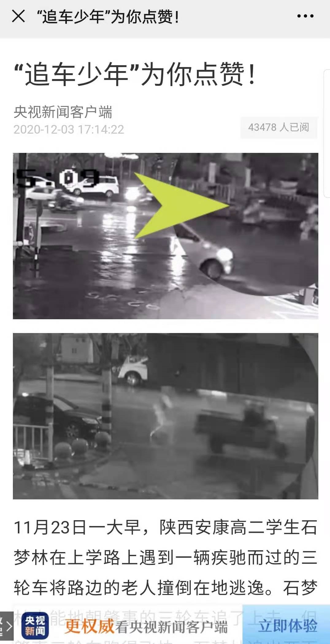 新聞鏈接:奮勇追攔肇事車 緊急救助受傷者 安康學子見義勇為顯擔當
