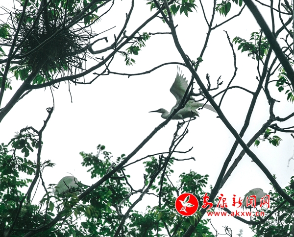 本網(wǎng)訊(記者 潘潤生 實習(xí)記者 安琛)在建設(shè)中的高新區(qū)新時代大道施工現(xiàn)場,遠(yuǎn)遠(yuǎn)望去,有一片“突兀”的小樹林,林中有30多個鳥窩,大量白鷺在樹叢中引吭、飛舞。4月23日,大雨滂沱,記者在接到線索趕到這里時,就立刻被這雨中雪白的精靈震撼、吸引。
