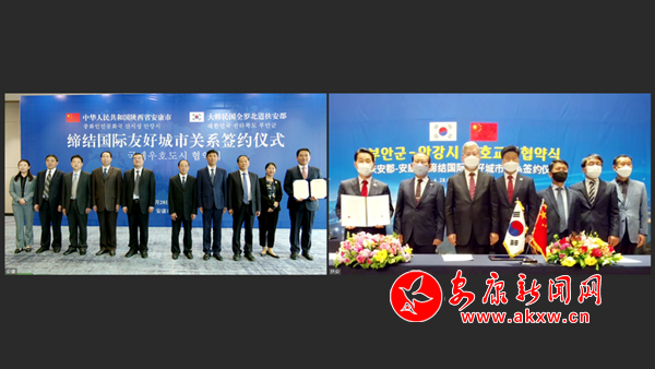 本網(wǎng)訊(記者 艾蓓 通訊員 梁石)4月28日,“中華人民共和國陜西省安康市和大韓民國全羅北道扶安郡締結(jié)國際友好城市關(guān)系簽約儀式”通過互聯(lián)網(wǎng)線上舉行,兩地正式簽署建立國際友好城市關(guān)系協(xié)議書。市長趙俊民、市人大常委會(huì)副主任周永鑫、市政府秘書長陳伍文,扶安郡郡守權(quán)翼鉉、扶安郡議會(huì)議長文燦奇等嘉賓分別在兩地出席簽約儀式,中國駐韓國光州總領(lǐng)事張承剛應(yīng)邀參加活動(dòng)。