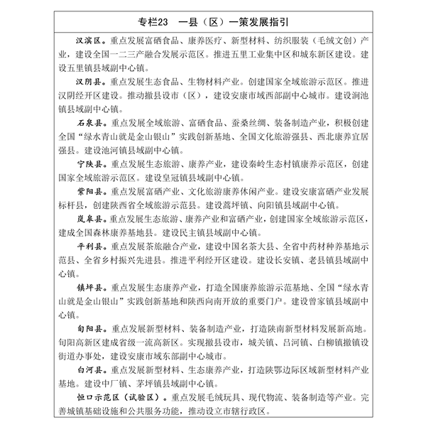 構(gòu)建“一核、兩心、兩帶、多點”新型城鎮(zhèn)化格局。一核:以中心城市為核心,推動瀛湖生態(tài)旅游區(qū)、恒口示范區(qū)(試驗區(qū))融入中心城市發(fā)展。兩心:推進漢陰、旬陽市域副中心城市建設(shè)。兩帶:月河川道城鎮(zhèn)帶,統(tǒng)籌中心城市—恒口—漢陰—石泉協(xié)同發(fā)展,建設(shè)城鄉(xiāng)統(tǒng)籌示范區(qū)、新型工業(yè)聚集區(qū)、綠色發(fā)展引領(lǐng)區(qū)。漢江生態(tài)城鎮(zhèn)帶,以漢濱、石泉、旬陽為核心,漢陰、紫陽、嵐皋、白河為節(jié)點,輻射帶動其他區(qū)域,打造三產(chǎn)融合發(fā)展的漢江生態(tài)城鎮(zhèn)帶。多點:以其他縣城、重點鎮(zhèn)、縣域工業(yè)集中區(qū)、現(xiàn)代農(nóng)業(yè)園區(qū)和旅游景區(qū)為節(jié)點,打造縣域經(jīng)濟增長極。