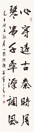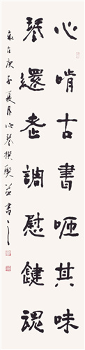 其中以書法進(jìn)益尤快, 在趙心琴看來,畫家必須勤習(xí)書法,她認(rèn)為好的書法必須出于情理之中、法度之外,性情中人的她書法也是性情之作,常常隨著性情表達(dá)自己的心境。她可以從行書中求變化,楷書中找活潑,在隸書中也不墨守成規(guī),重視臨摹但不拘泥于過去的范本,每一幅書法作品都是自己針對不同的主體作出的創(chuàng)作,每幅作品都求新求變。同時她認(rèn)為稱心的國畫作品必須把好題款這道關(guān),如此方才相映成輝。2012年,省圖書館舉辦陜西作家書畫展,趙心琴應(yīng)邀出席,觀展時觸景生情,三五天后,一副不忘家鄉(xiāng)養(yǎng)育恩“巴山承心志,漢水潤琴音”的嵌名處女聯(lián)誕生了!此后,興致所致,偶有妙句成聯(lián)。再后來,一發(fā)不可收,僅以她的名字“心琴”二字,前后不重復(fù),內(nèi)容不重復(fù),陸陸續(xù)續(xù)累計撰寫了三百多副藏名聯(lián)。據(jù)趙心琴講:有時她為一字的斟酌耗費(fèi)幾天精力,甚至夜不成寐。