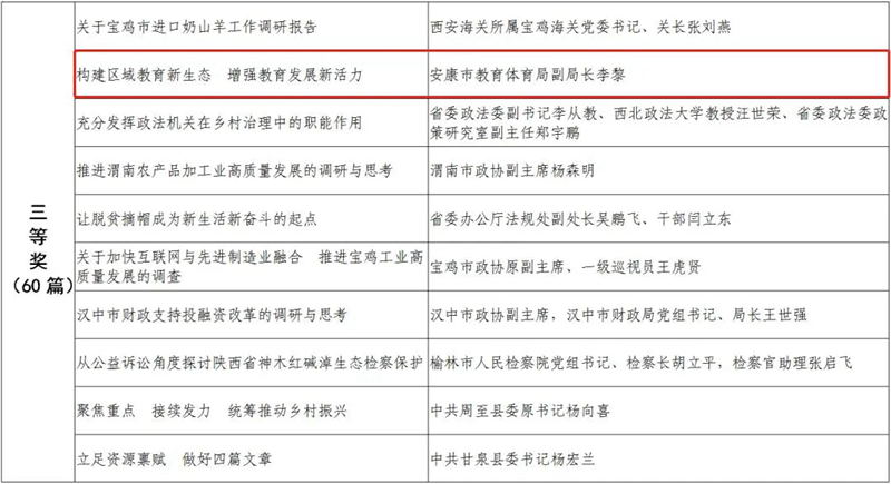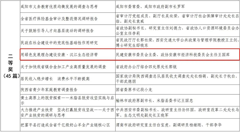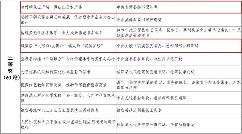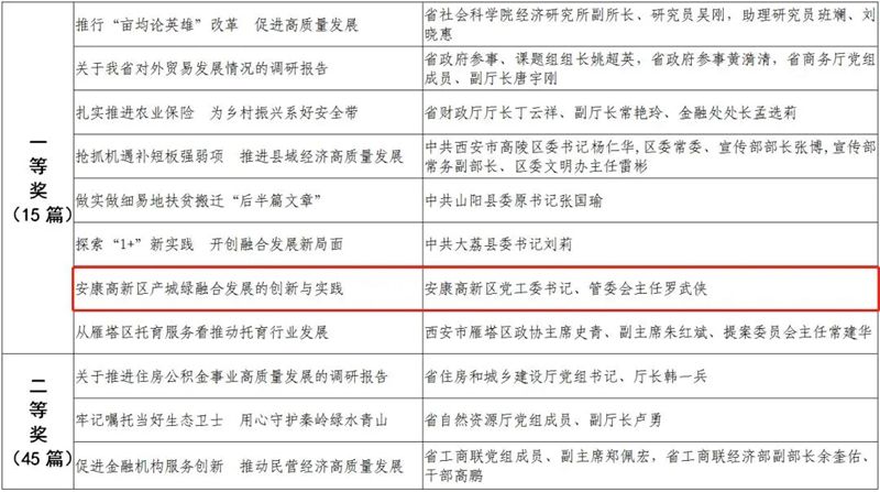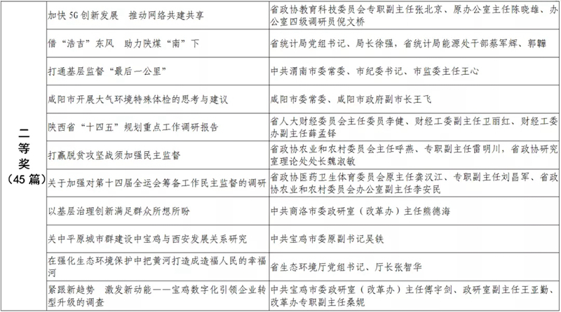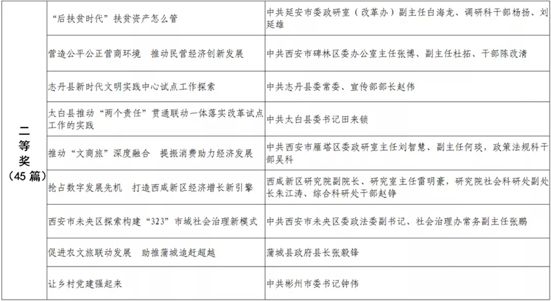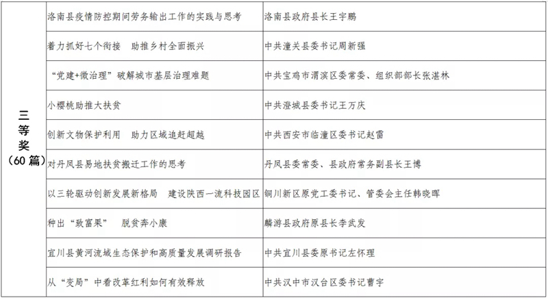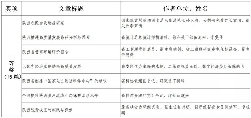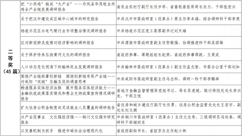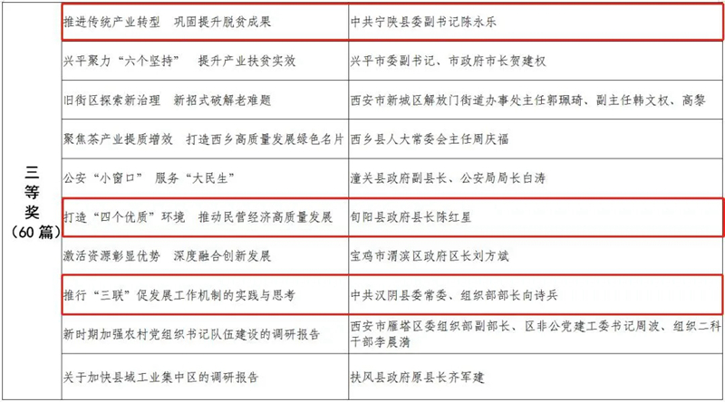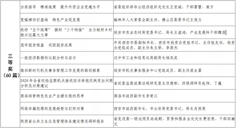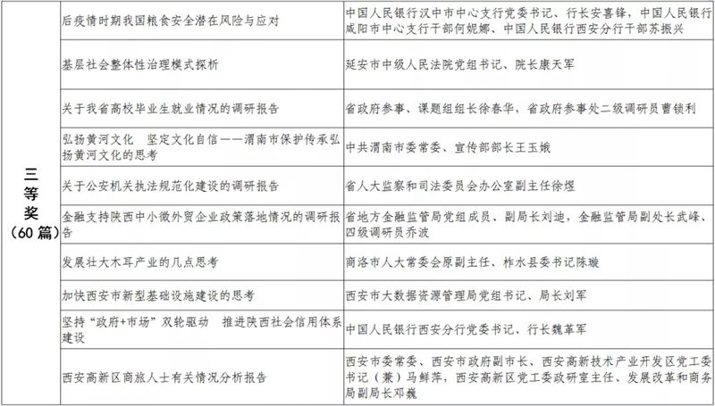 據(jù)悉,全省黨政領(lǐng)導(dǎo)干部優(yōu)秀調(diào)研成果評選工作迄今已開展了18年。本次評選活動從全省市縣兩級和省級各部門上報(bào)的487篇縣處級以上黨政領(lǐng)導(dǎo)干部調(diào)研報(bào)告中,評出獲獎優(yōu)秀調(diào)研成果120篇。其中,《陜西農(nóng)民增收路徑研究》等15篇獲一等獎,《關(guān)于推進(jìn)住房公積金事業(yè)高質(zhì)量發(fā)展的調(diào)研報(bào)告》等45篇獲二等獎,《后疫情時期我國糧食安全潛在風(fēng)險(xiǎn)與應(yīng)對》等60篇獲三等獎。