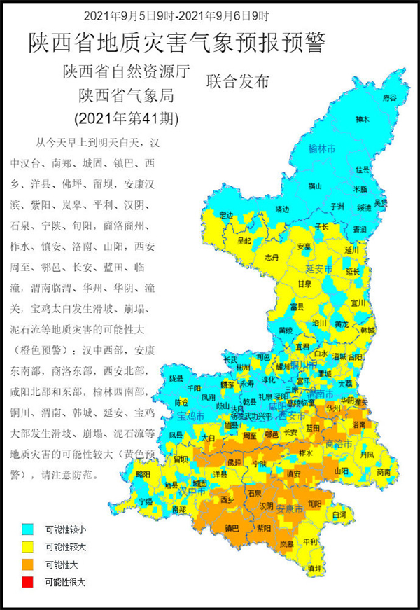 預(yù)計(jì)2021年9月5日09時(shí)至2021年9月6日09時(shí),漢中漢臺(tái)、南鄭、城固、鎮(zhèn)巴、西鄉(xiāng)、洋縣、佛坪、留壩,安康漢濱、紫陽、嵐皋、平利、漢陰、石泉、寧陜、旬陽,商洛商州、柞水、鎮(zhèn)安、洛南、山陽,西安周至、鄠邑、長安、藍(lán)田、臨潼,渭南臨渭、華州、華陰、潼關(guān),寶雞太白發(fā)生滑坡、崩塌、泥石流等地質(zhì)災(zāi)害的可能性大(橙色預(yù)警);漢中西部,安康東南部,商洛東部,西安北部,咸陽北部和東部,榆林西南部,銅川、渭南、韓城、延安、寶雞大部發(fā)生滑坡、崩塌、泥石流等地質(zhì)災(zāi)害的可能性較大(黃色預(yù)警),請(qǐng)注意防范。