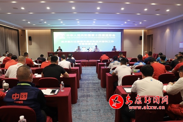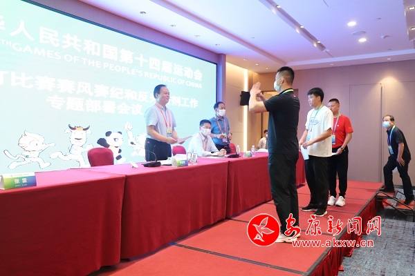 會議傳達學習了《體育總局辦公廳關于印發(fā)<第十四屆全國運動會賽風賽紀違規(guī)處罰規(guī)定>的通知》;宣讀了《第十四屆全運會武術散打決賽運動隊賽風賽紀和反興奮劑工作責任書》、《第十四屆全國運動會武術散打決賽領隊、教練員參賽承諾書》。