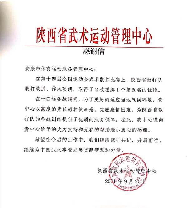 第十四屆全國運動會武術(shù)散打比賽圓滿結(jié)束,陜西省散打隊敢打敢拼、作風(fēng)硬朗,取得了2枚銀牌1個第五名的佳績。在十四運備戰(zhàn)期間,我市克服疫情困難,為陜西省散打隊的備戰(zhàn)訓(xùn)練提供了優(yōu)質(zhì)的服務(wù)保障,讓隊員更好地適應(yīng)安康氣侯環(huán)境。感謝信中寫道:“希望在今后的工作中,繼續(xù)攜手共進,并肩前行,為中國武術(shù)事業(yè)發(fā)展貢獻智慧和力量。”7mL安康新聞網(wǎng)