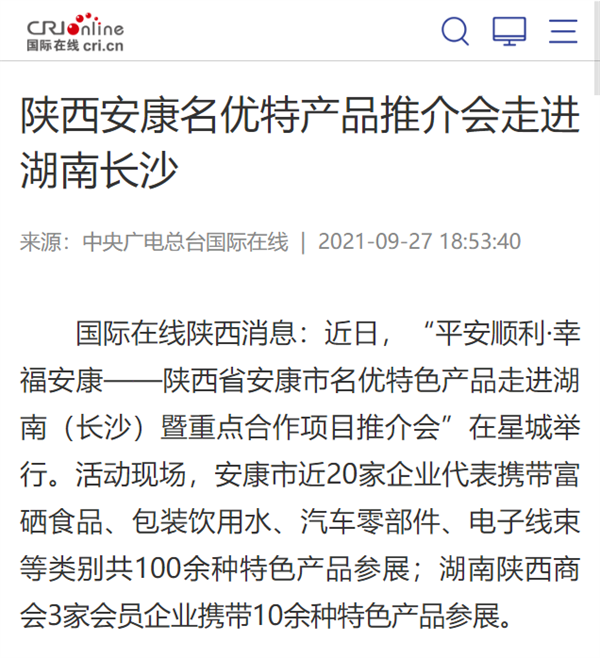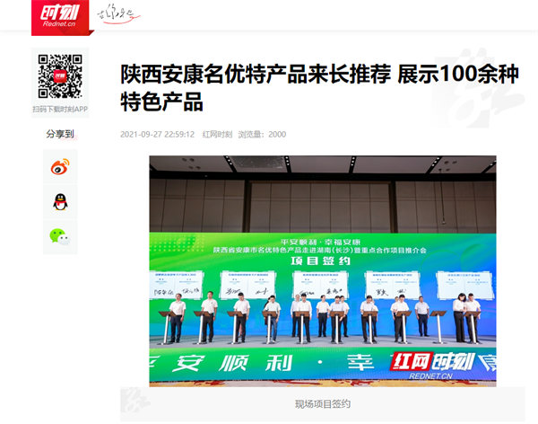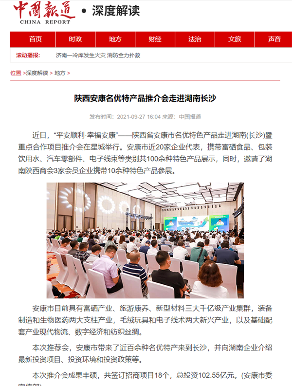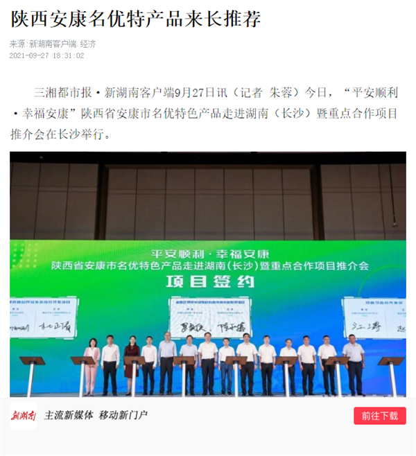 本網(wǎng)訊 9月27日,由中共安康市委、安康市人民政府,陜西省商務廳聯(lián)合主辦的“平安順利·幸福安康——陜西省安康市名優(yōu)特色產(chǎn)品走進湖南(長沙)暨重點合作項目推介會”在長沙市成功舉辦。新華社、中國交通廣播、中國報道、湖南日報、長沙晚報、三湘都市報、國際在線、紅網(wǎng)等中省、長沙以及駐長多家媒體紛紛給予報道。媒體不僅高度贊揚兩地的合作成果,并對安康有了一個嶄新的評價和認識。一起看看“老親戚”長沙眼中的“老鄰居”安康是什么樣!B2S安康新聞網(wǎng)