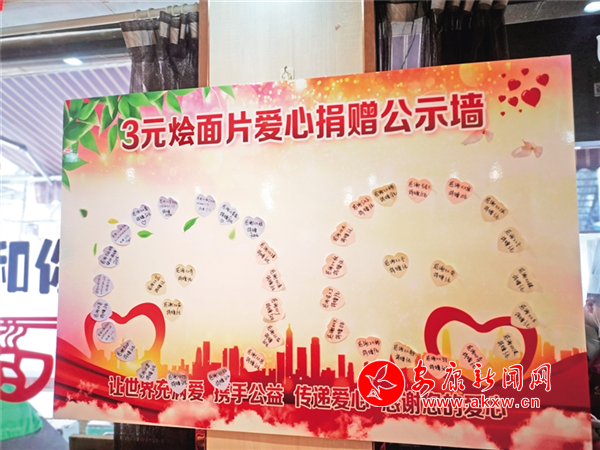 “感謝XX蕊捐款10元,感謝馬遠(yuǎn)鵬律師捐款20元,感謝XX默為環(huán)衛(wèi)工人認(rèn)購(gòu)燴面片10份捐款30元,感謝山茶花捐款80元,感謝XX娃捐款300元……”大廳西墻壁新設(shè)置的“愛心捐款公示墻”上,貼滿了連日來通過微信、現(xiàn)金等方式,認(rèn)購(gòu)燴面片的愛心人士的昵稱和捐款金額。