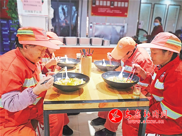 十幾年前,向美玉從湖南遠(yuǎn)嫁至安康,幾年前加入了“城市美容師”的行列,負(fù)責(zé)清掃城區(qū)高井加油站附近的街面,平日起早貪黑,緊趕慢趕,區(qū)域內(nèi)衛(wèi)生才能保持干凈。如果中途回家吃個(gè)飯,就太耽誤時(shí)間了。得知天源飯莊為環(huán)衛(wèi)工人準(zhǔn)備了熱氣騰騰的燴面片,她便和同事一起過來就餐。“冬天能吃一碗美味的燴面片,我們心里暖暖的,感謝老板和愛心人士對(duì)我們的關(guān)愛。”向美玉說。