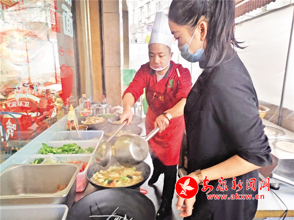 店外操作間,兩位廚師忙碌地烹調(diào)著香味四溢的燴面片。操作臺(tái)上一口口大碗中,被廚師逐個(gè)放入粉條、木耳、黃花菜……少頃,熱氣騰騰的燴面片就端到環(huán)衛(wèi)工人面前,環(huán)衛(wèi)工人被凍紅的臉頰泛起了笑容。