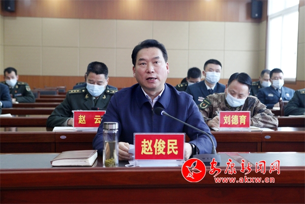 趙俊民強(qiáng)調(diào),要舉旗鑄魂強(qiáng)引領(lǐng),鞏固拓展黨史學(xué)習(xí)教育成果,持續(xù)深入學(xué)習(xí)貫徹習(xí)近平強(qiáng)軍思想,堅決、全面、具體、無條件地貫徹軍委主席負(fù)責(zé)制,增強(qiáng)“四個意識”、堅定“四個自信”、做到“兩個維護(hù)”,把堅定捍衛(wèi)“兩個確立”落實到部隊建設(shè)實踐中,確保強(qiáng)軍興軍始終沿著正確方向前進(jìn)。要認(rèn)真落實新時代黨的建設(shè)總要求,嚴(yán)格落實《中國共產(chǎn)黨軍隊黨的建設(shè)條例》《中國共產(chǎn)黨軍隊委員會(支部)工作規(guī)定》,不斷增強(qiáng)各級黨組織的領(lǐng)導(dǎo)力、組織力、執(zhí)行力。要練兵備戰(zhàn)提能力,堅持一切工作向能打仗、打勝仗聚焦,持續(xù)增強(qiáng)全民國防觀念,著力提高國防動員能力,不斷加強(qiáng)民兵訓(xùn)練基地和民兵隊伍建設(shè),突出抓好實戰(zhàn)化訓(xùn)練,切實做到召之即來、來之能戰(zhàn)、戰(zhàn)之必勝。