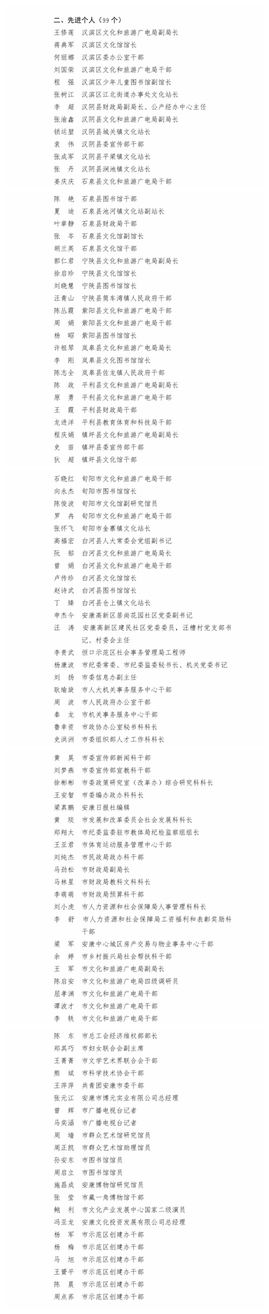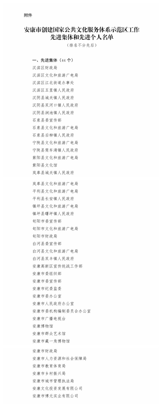 近日,中共安康市委、安康市人民政府下發(fā)了《關(guān)于表彰創(chuàng)建國(guó)家公共文化服務(wù)體系示范區(qū)工作先進(jìn)集體和先進(jìn)個(gè)人的決定》,具體內(nèi)容如下:Kyt安康新聞網(wǎng)