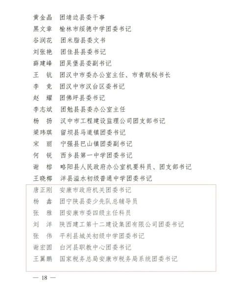 為表彰先進(jìn),激勵廣大團(tuán)員、團(tuán)干部和基層團(tuán)組織奮發(fā)有為、 再創(chuàng)佳績,共青團(tuán)陜西省委近日表彰了2020-2021 年度“陜西省優(yōu)秀共青團(tuán)員”“陜西省優(yōu)秀共青團(tuán)干部”“陜西省五四紅旗團(tuán)支部”“陜西省五四紅旗團(tuán)委”。我市李岸緯等12名共青團(tuán)員、唐正剛等9名共青團(tuán)干部、安康市審計局團(tuán)總支等9個團(tuán)總支(支部)、安康市漢濱區(qū)稅務(wù)局團(tuán)委等7個團(tuán)委獲得表彰!