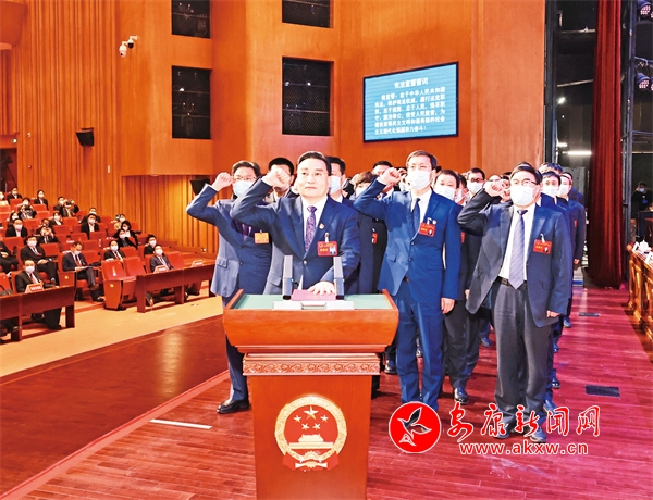 新當選的市級國家機關(guān)工作人員向憲法宣誓,新當選的市五屆人大常委會主任王彪、市人民政府市長武文罡分別領(lǐng)誓。