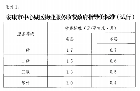 附:1、《安康市中心城區(qū)物業(yè)服務(wù)收費(fèi)政府指導(dǎo)價(jià)標(biāo)準(zhǔn)》(試行);