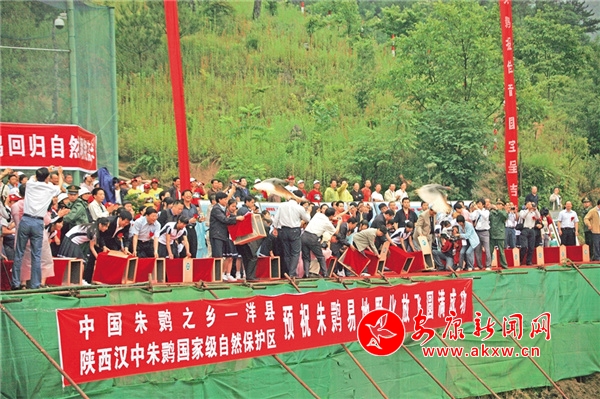 2007年5月31日,中國陜西朱鹮野化放飛儀式正式在寧陜縣寨溝村舉行。中省領(lǐng)導出席了放飛儀式,并打開鳥籠,一起放飛了20只朱鹮,隨后,放飛基地的技術(shù)人員、寧陜縣的群眾代表和學生代表又放飛6只。隨著放飛的朱鹮翱翔藍天,標志著朱鹮保護由單純的人工搶救開始轉(zhuǎn)向回歸自然的新階段,朱鹮搶救保護的歷史掀開了新的一頁。
