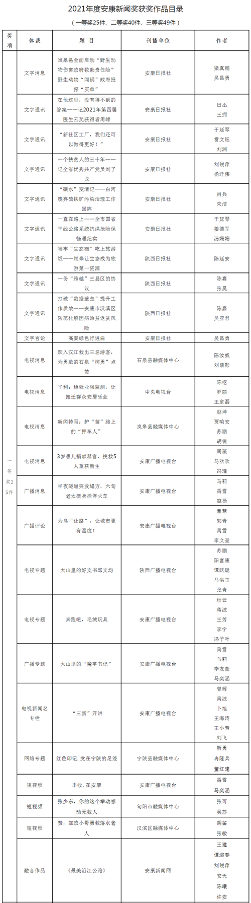 2021年度安康新聞獎(jiǎng)評(píng)審工作在中共安康市委宣傳部的指導(dǎo)下,由市記協(xié)具體組織實(shí)施,經(jīng)過各申報(bào)單位推薦,市記協(xié)初審、復(fù)審并組織專家定評(píng),評(píng)選出擬獲安康新聞獎(jiǎng)作品114件,其中一等獎(jiǎng)25件、二等獎(jiǎng)40件、三等獎(jiǎng)49件。