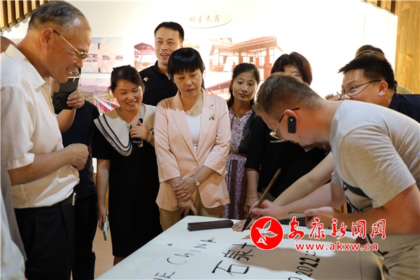 在石泉縣金蠶小鎮(zhèn),外國(guó)記者朋友們先后深入鎏金銅蠶出土處和金蠶之鄉(xiāng)展覽館,現(xiàn)場(chǎng)探尋金蠶歷史,感受絲路文化。大家均被眼前燦爛悠久的蠶桑文化觸動(dòng),不禁發(fā)出贊嘆:絲綢之路真?zhèn)ゴ!參觀結(jié)束,各路記者們久久不愿離去,連連用毛筆在紙上為這片土地留下不同語(yǔ)言的祝福。來(lái)自白俄羅斯國(guó)家廣播電視公司的安東·瓦休凱維奇甚至用流暢的中文寫(xiě)下——“石泉十美”,以表達(dá)對(duì)“絲路源點(diǎn)”省的熱愛(ài)。阿曼觀點(diǎn)報(bào)記者費(fèi)薩爾·賽義德·穆罕默德·阿爾薩迪則用阿拉伯語(yǔ)寫(xiě)下:“絲綢之路將我們連接在一起!”他寫(xiě)完后意味深長(zhǎng)地表示:“來(lái)到展覽館之后,我更加深刻地認(rèn)識(shí)到,絲綢之路是將阿拉伯人和阿拉伯歷史跟中國(guó)歷史連接在一起的重要橋梁。”