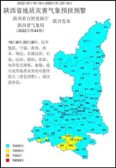 陜西省自然資源廳與陜西省氣象局聯(lián)合發(fā)布地質(zhì)災(zāi)害氣象預(yù)報預(yù)警:預(yù)計2022年9月19日8時至2022年9月20日8時,漢中勉縣、寧強、南鄭、西鄉(xiāng)、鎮(zhèn)巴,安康漢濱、石泉、漢陰、紫陽、嵐皋、旬陽發(fā)生滑坡、崩塌、泥石流等地質(zhì)災(zāi)害的可能性較大(黃色預(yù)警),請注意防范。