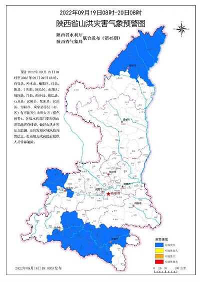 陜西省水利廳與陜西省氣象局聯(lián)合發(fā)布山洪災(zāi)害氣象預(yù)警:預(yù)計2022年09月19日08時至2022年09月20日08時,府谷縣、神木市、榆陽區(qū)、佳縣、隴縣、千陽縣、陳倉區(qū)、南鄭區(qū)、城固縣、洋縣、西鄉(xiāng)縣、鎮(zhèn)巴縣、石泉縣、漢陰縣、紫陽縣、漢濱區(qū)、旬陽市、嵐皋縣等縣(市、區(qū))有可能發(fā)生山洪災(zāi)害(藍色預(yù)警)。各級水利部門要加強山洪隱患巡查排查,做好山洪災(zāi)害站點監(jiān)測,及時發(fā)布區(qū)域風(fēng)險預(yù)警信息,提請地方政府提前組織人員轉(zhuǎn)移避險。