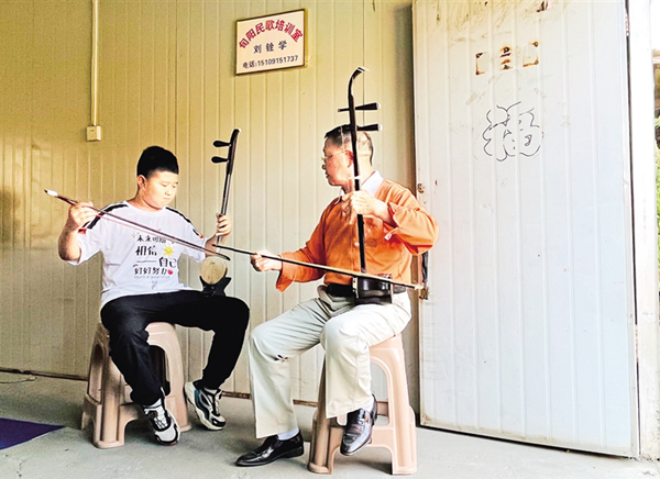 “旬陽(yáng)民歌調(diào)子悠揚(yáng)、速度緩,高腔多。曲折細(xì)膩,但又簡(jiǎn)單規(guī)整,淳樸里還有靈動(dòng)。”興趣使然,年幼的劉銓學(xué)很快便領(lǐng)略到其中樂(lè)趣,沉迷于這股清新的山野之風(fēng)。“當(dāng)時(shí)拜師規(guī)矩很大,要寫(xiě)拜師帖,學(xué)哪些東西,學(xué)多久,都寫(xiě)得清清楚楚。學(xué)完了再寫(xiě)謝師狀,這樣才算出師,才能帶徒弟。學(xué)的東西門(mén)路也多,號(hào)子和小調(diào)不一樣,紅事和白事唱的也不一樣,每一個(gè)環(huán)節(jié)都有固定的曲目。”劉銓學(xué)回憶說(shuō)。于是點(diǎn)香磕頭,劉銓學(xué)先后拜在了同村的李宏富和錢(qián)禮寶兩位老藝人門(mén)下。白天上學(xué)干農(nóng)活,晚上吊嗓子、練身段兒,至高中畢業(yè)時(shí),劉銓學(xué)已經(jīng)學(xué)會(huì)了京胡、二胡、板胡在內(nèi)的十幾種樂(lè)器,以及漢劇中唱念做打等基本功。