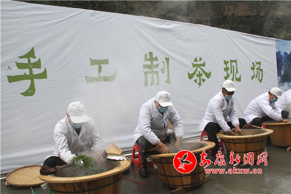 制茶人現(xiàn)場炒茶,介紹制茶的流程,突出嵐皋茶獨(dú)特制作工藝;茶藝師現(xiàn)場沖泡春茶,攤青、殺青、揉捻、做形、烘焙…新火試新茶,手工漸次綻現(xiàn),呈現(xiàn)千年古法傳承之景。