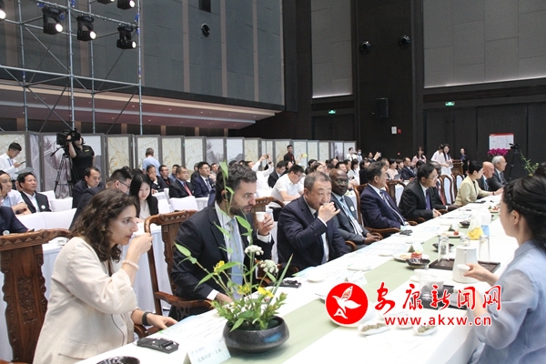 志合者,不以山海為遠。鐘洪江代表陜西省政府向與會嘉賓表示誠摯歡迎,向長期以來關心支持陜西發(fā)展的國際友人表示衷心感謝。他表示,2000多年前,中國茶葉從長安古城出發(fā),沿著絲綢之路遠銷海外,成為東西方文明交流的紐帶。今天,優(yōu)質多樣的陜茶一定能借助“一帶一路”的東風香飄四海,成為各國之間友誼的使者。讓我們共飲這杯文化茶、共鑒這杯健康茶、共享這杯致富茶、共品這杯友誼茶,以茶為媒、以茶會友,共謀發(fā)展、共創(chuàng)未來。