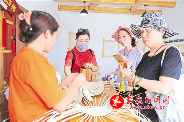 “一扇天下”的女主人叫李宗琴,作坊里有編制的螞蚱、蝎子、竹蜻蜓、竹簍、棕扇等,就連店里的微信收款二維碼也是編制而成。李宗琴是中壩村人,出嫁外地后,聽說村里建成作坊小鎮(zhèn),返鄉(xiāng)辦起手工編織作坊。自己編棕扇的同時,她還把手藝無償傳授給鄉(xiāng)親們,鄉(xiāng)親們編好后,她回收銷售,既傳承了手藝,也為鄉(xiāng)親們拓寬了增收的新路子。
