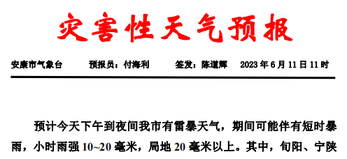 6月11日11時,安康市氣象臺發(fā)布災(zāi)害性天氣預(yù)報: