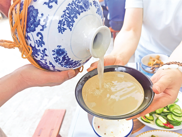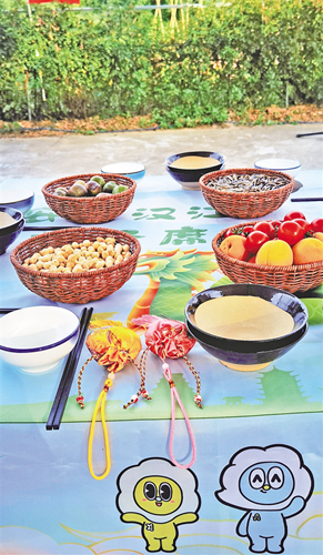 今年的漢江排子席是在復(fù)原的基礎(chǔ)上完善創(chuàng)新,有過安康門、開席、演唱漢江號(hào)子、安康非遺展示等多個(gè)環(huán)節(jié)。菜色方面,有四碗柱子果寓意四平八穩(wěn),插放梔子花、石榴花,寓意祥符瑞氣、多子多福,一壇黑陶稠酒,上放扎紅飄帶竹制酒提,開席后由祝酒仙子用酒提從酒壇斟酒。