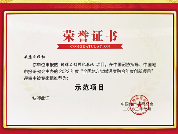 7月9日,全國地市媒體全媒體傳播體系建設(shè)推進(jìn)大會在內(nèi)蒙古烏蘭浩特市舉行。會上,對第二屆全國地方黨媒融合發(fā)展創(chuàng)新項(xiàng)目進(jìn)行了表彰,安康日報(bào)社的《傳媒文創(chuàng)孵化基地》獲“示范項(xiàng)目”大獎,此獎項(xiàng)陜西共兩家媒體通過評審獲獎。