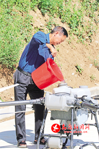 作為西河村獼猴桃園區(qū)負(fù)責(zé)人,69歲的何克祥正站在山路上指揮著無(wú)人機(jī)對(duì)園區(qū)果樹(shù)進(jìn)行飛防。