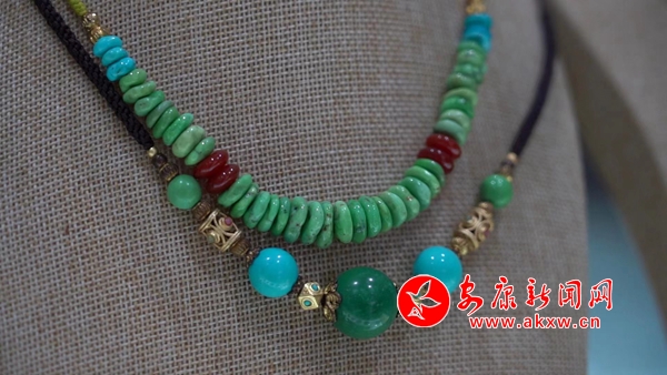 松石展柜中,擺放著各類精致時(shí)尚的綠松石飾品,這些通過雕刻家設(shè)計(jì)打磨后的擺件、項(xiàng)鏈、手鏈、耳墜等,都是藝術(shù)臻品,它們吸引著人們的目光,讓人愛不釋手。