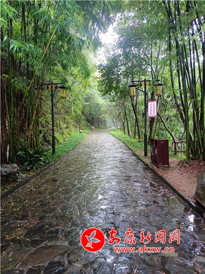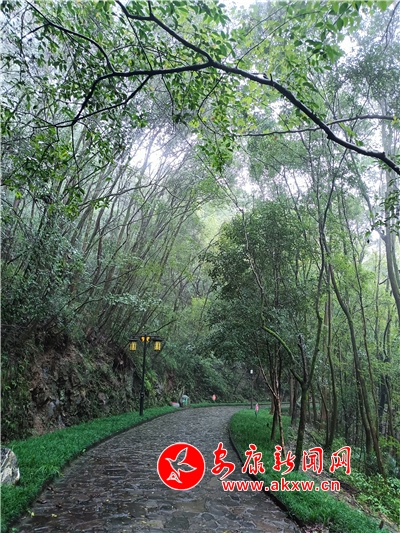 福道被雨水清洗得纖塵不染,旁邊,筆直粗壯的松柏、楓柳從谷底拔地而起,直插云霄。七里香、救命糧的藤蔓盤來繞去,織得密不透風(fēng),像天然的綠色屏障。青綠的葉子經(jīng)過雨水的沖洗,像一枚枚翡翠,綠得耀眼。那些晶亮亮的雨珠在葉子上肆意地滾動著,有的調(diào)皮地掛在葉尖上,風(fēng)輕輕一吹,“啪”地掉落下來,摔碎了一段疼痛的記憶。因為太早,又是雨天,路上幾乎沒有行人,一向早起的鳥兒也趁機偷懶,躲在巢里睡大覺,少了它們曼妙的歌聲。天地間,只有細雨與林木親昵時發(fā)出的窸窸窣窣的各種細碎聲響。