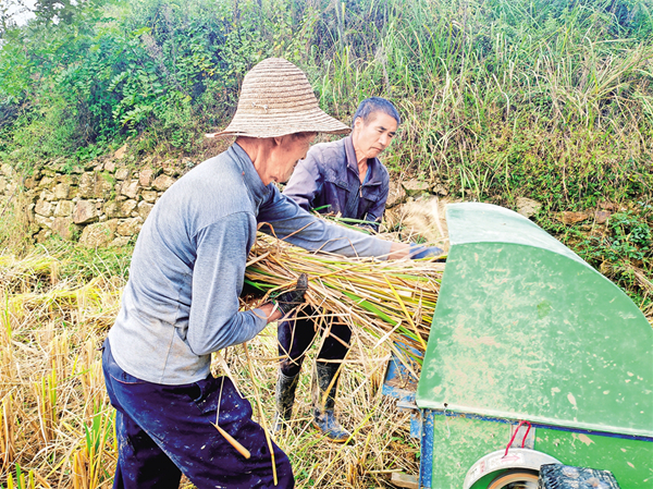 本網(wǎng)訊(記者 楊遷偉 孫妙鴻)風(fēng)吹稻田千重浪,又到一年秋收時(shí)。10月13日,記者來(lái)到漢陰縣蒲溪鎮(zhèn)盤龍村試種的90余畝“巨型稻”試驗(yàn)田,層層疊疊的稻田一片金黃,一株株高大的“巨型稻”傲然挺立,“個(gè)頭”明顯比旁邊稻田里普通水稻高出許多,長(zhǎng)而飽滿的稻穗低垂著迎風(fēng)搖擺,村民們正搶抓晴好天氣,加緊收割。