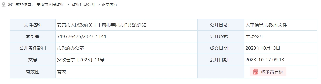 安康市人民政府關(guān)于王海彬等同志任職的通知