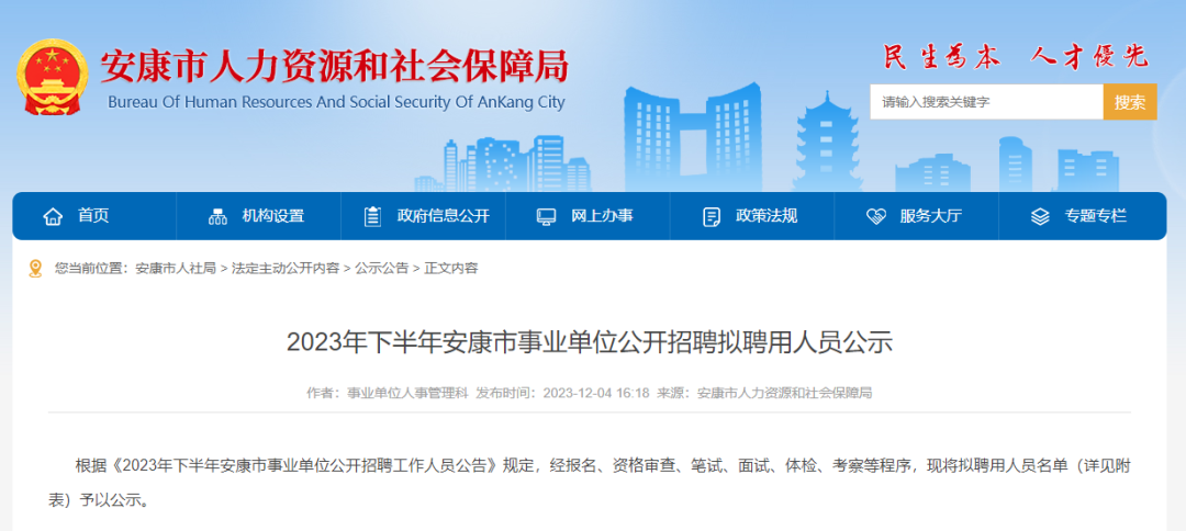 12月4日,安康市人力資源和社會(huì)保障局發(fā)布2023年下半年安康市事業(yè)單位公開(kāi)招聘擬聘用人員公示。z4K安康新聞網(wǎng)