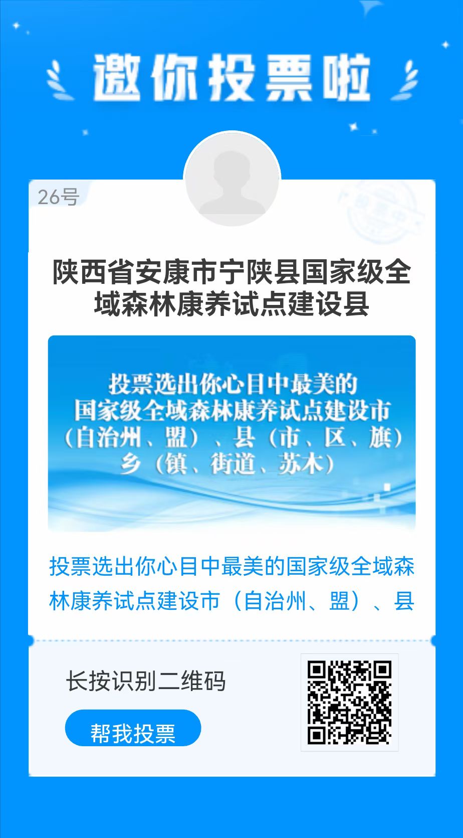 據(jù)了解,國(guó)家級(jí)森林康養(yǎng)試點(diǎn)建設(shè)單位認(rèn)定工作由中國(guó)林業(yè)產(chǎn)業(yè)聯(lián)合會(huì)負(fù)責(zé)開(kāi)展,經(jīng)自愿申報(bào)、主管部門(mén)審核推薦、合規(guī)用地和安全經(jīng)營(yíng)專項(xiàng)檢查、當(dāng)?shù)毓尽<覍彶榧罢J(rèn)定結(jié)果全國(guó)公示等程序,確定了2023年國(guó)家級(jí)森林康養(yǎng)試點(diǎn)建設(shè)單位名單。同時(shí)還開(kāi)設(shè)投票活動(dòng),選出大眾心目中最美的國(guó)家級(jí)森林康養(yǎng)試點(diǎn)建設(shè)基地和中國(guó)森林康養(yǎng)人家,請(qǐng)為森林履蓋率全國(guó)第一的“秦嶺之心 綠都寧陜”投上您寶貴的3票。ㄩL(zhǎng)按二維碼即可投票,每個(gè)微信號(hào)每天可投3票)