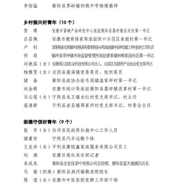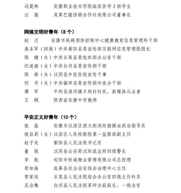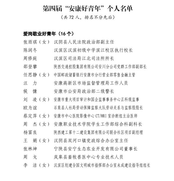近日,由市委組織部、市委宣傳部、市委文明辦、市委政法委、市委網(wǎng)信辦、市教體局、市科技局、市民政局、市人社局、市鄉(xiāng)村振興局、市衛(wèi)健委、團(tuán)市委、市青聯(lián)共同開展的第四屆“‘中國夢·青年志’——尋找身邊的安康好青年”主題活動結(jié)果揭曉。