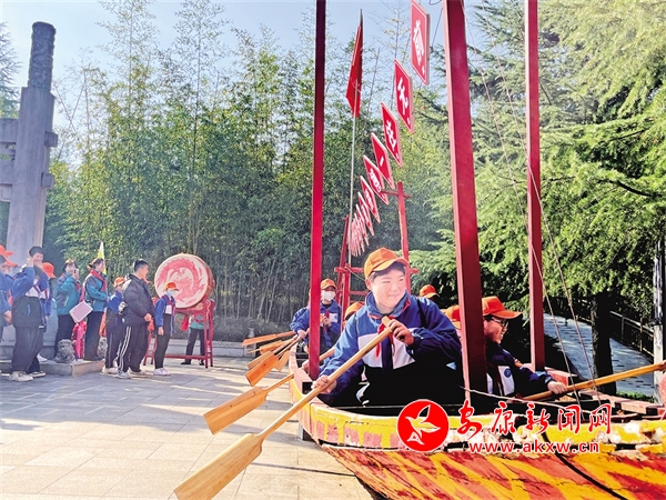 進入翠屏島景區(qū),一艘龍舟顯得格外醒目,這是中國安康第十八屆漢江龍舟賽活動中獲得第一名的冠軍船,也是瀛湖代表隊的勝利之船。登上冠軍船體驗劃龍舟,是瀛湖研學(xué)中的重要一課。“賽龍舟作為安康傳統(tǒng)文化活動,是極具特色和代表性的,讓學(xué)生體驗劃龍舟,不僅很好地傳播了地方文化,也能將龍舟精神傳遞給學(xué)生,激勵他們團結(jié)一致、勇往直前。”羅上順是陜文投安文旅公司的工作人員,同時也參與過好幾屆龍舟賽,在他的帶領(lǐng)下,學(xué)生們一邊喊著口號,一邊用力劃槳。“劃龍舟竟然是跪在船上的,一會工夫我的膝蓋就好疼了,那些在賽場上的選手真厲害!”同學(xué)們紛紛發(fā)出感嘆。