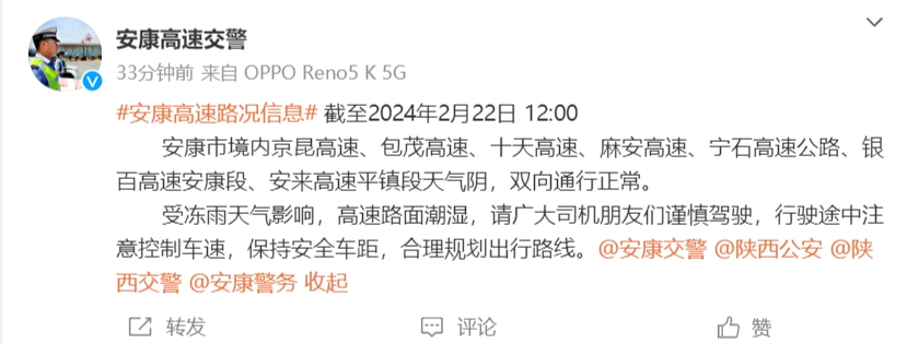 據(jù)安康高速交警消息:截至2024年2月22日12:00,安康市境內京昆高速、包茂高速、十天高速、麻安高速、寧石高速公路、銀百高速安康段、安來高速平鎮(zhèn)段天氣陰,雙向通行正常。受凍雨天氣影響,高速路面潮濕,請廣大司機朋友們謹慎駕駛,行駛途中注意控制車速,保持安全車距,合理規(guī)劃出行路線。 hKJ安康新聞網(wǎng)