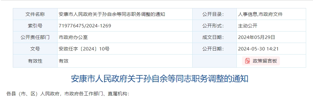 孫自余同志任市政府副秘書長(正縣級),免去市政府督查室正縣級督查專員職務;