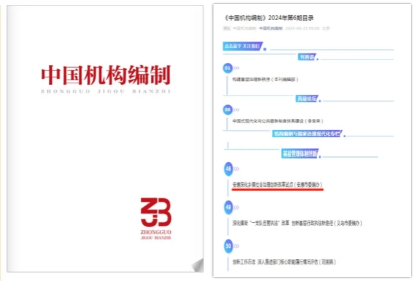 6月25日,《中國機構(gòu)編制》2024年第6期以題為《安康深化鄉(xiāng)鎮(zhèn)社會治理創(chuàng)新改革試點》刊發(fā)我市深化鄉(xiāng)鎮(zhèn)社會治理創(chuàng)新改革試點經(jīng)驗文章,這也是繼《安康推進機構(gòu)編制監(jiān)督檢查全覆蓋》、《部門機構(gòu)編制事項動議初探》、《深化審批服務便民化改革》,我市機構(gòu)編制管理創(chuàng)新經(jīng)驗和調(diào)研成果第四次在全國機構(gòu)編制系統(tǒng)最高權(quán)威期刊“上榜”。