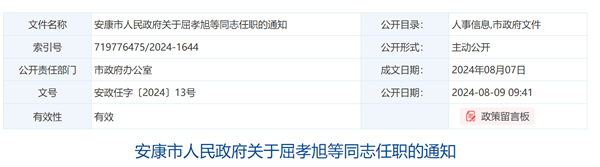 安康市人民政府關(guān)于屈孝旭等同志任職的通知