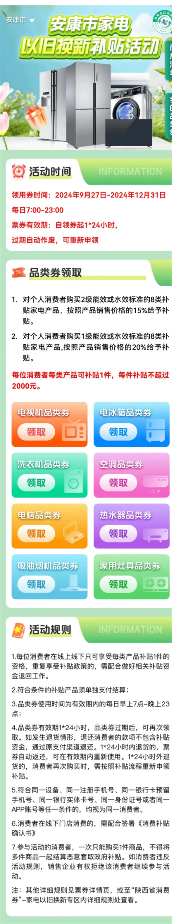※進(jìn)入“陜西省家電以舊換新專區(qū)-安康品類券”頁(yè)面。