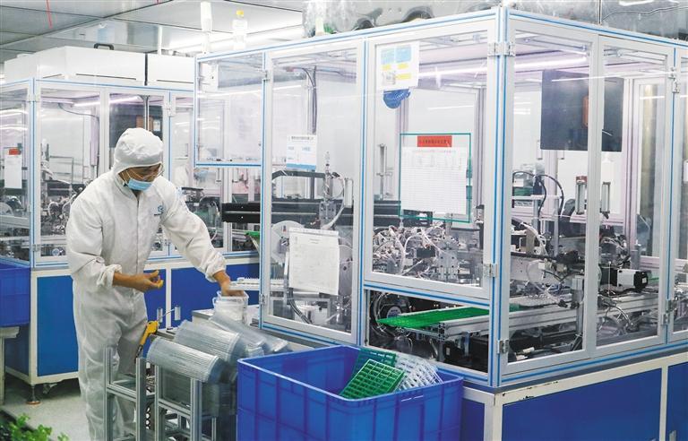 10月12日,在軒意光電生產(chǎn)車間,智能安防、5G通信光學器件等多條生產(chǎn)線開足馬力,產(chǎn)線整體自動化率超過90%。