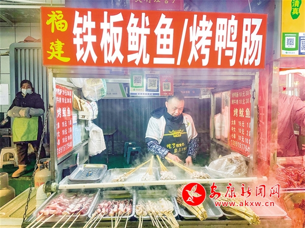 對此,在距離不遠(yuǎn)的金州路雙堤巷擺攤多年的福建人嚴(yán)國強(qiáng)有著更深的感觸。“我來安康有20多年了,主要賣烤魷魚,租個鋪子不劃算,就這種小車又方便成本也低。最開始我在市中心廣場附近擺攤,那時候流動性比較大,顧客也不太放心在我們這種小攤上消費(fèi)。這幾年政府倡導(dǎo)‘夜經(jīng)濟(jì)’,我就干脆搬過來了,今年給我們統(tǒng)一辦理了營業(yè)執(zhí)照、食品攤販登記備案卡,顧客一看這些證件,消費(fèi)起來更安心不說,對我們也是一種保障,能夠固定在一個地方長久地將生意做下去,水電這些也不用自己再想辦法解決,我很知足了。”