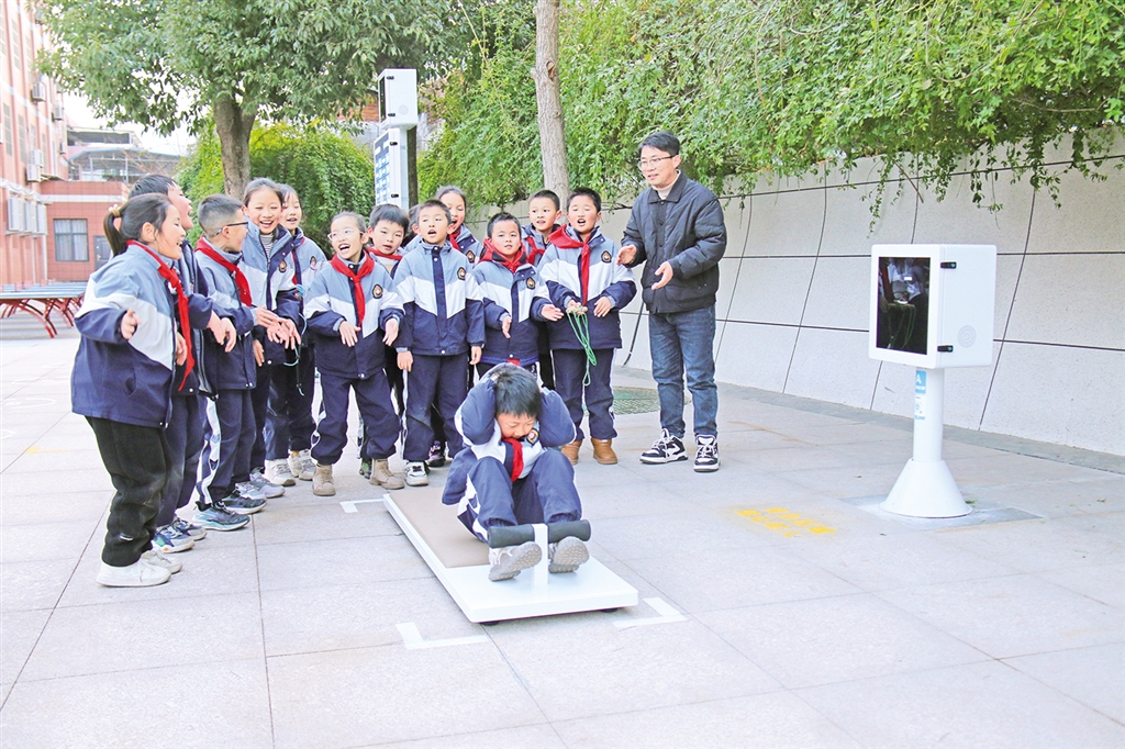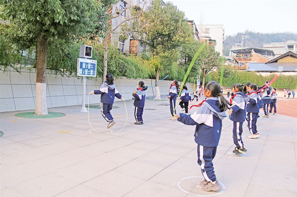 學生在AI智慧體育運動儀器感應區(qū)內跳繩。