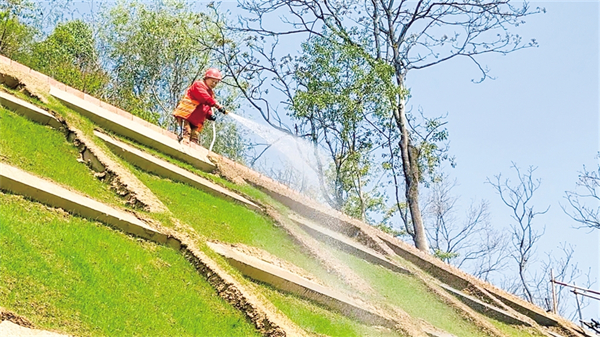 在“安康湖”博物館段南側(cè)生態(tài)修復(fù)工程現(xiàn)場,記者看到,這面曾經(jīng)因風(fēng)化裸露存在安全隱患的山體,如今通過噴漿、格構(gòu)梁護(hù)坡再覆綠的“地質(zhì)縫合術(shù)”重獲新生。